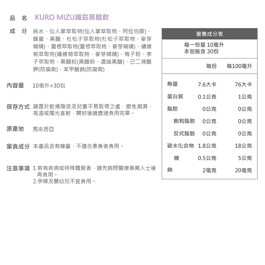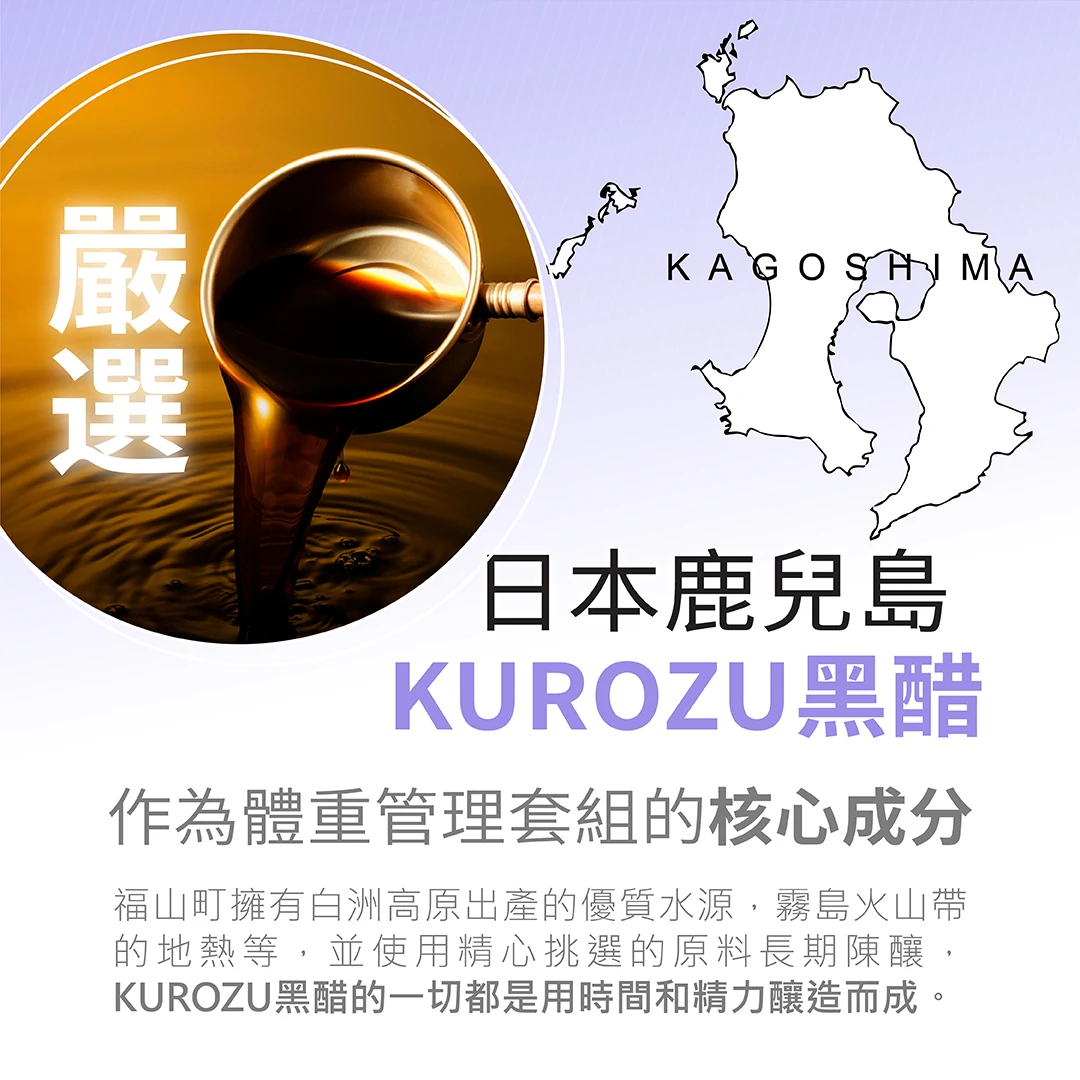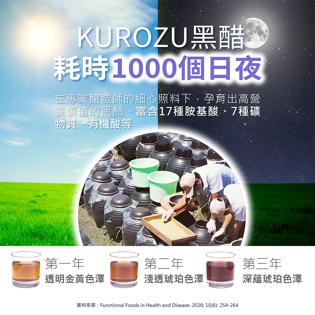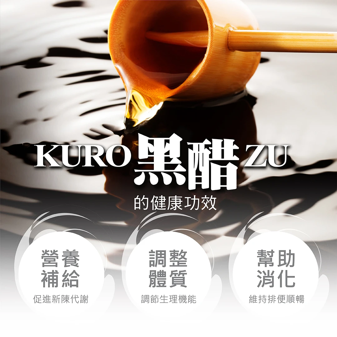 ◆獨家嚴選日本鹿兒島黑醋為核心成分,世上獨有的福山町釀醋法,耗時1000個日夜在專業釀造師細心照料下釀造而成,富含17種胺基酸、7種礦物質、有機酸等,達到營養補給、調整體質、幫助消化效果